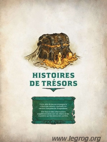 Histoires de Trésors compile différents objets que l’on peut trouver dans le Deck de Trésors. Tout comme le supplément précité, il s’agit ici d’une aide de jeu exclusive à la version française.