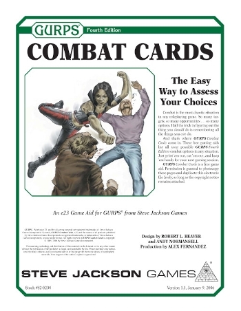 GURPS Combat Cards est une aide de jeu contenant des cartes à imprimer puis découper. Elles sont composées d’un titre, d’un éventuel sous-titre entre parenthèses, d’une description, d’un résumé synthétique des effets, et d’une référence à la page des règles.