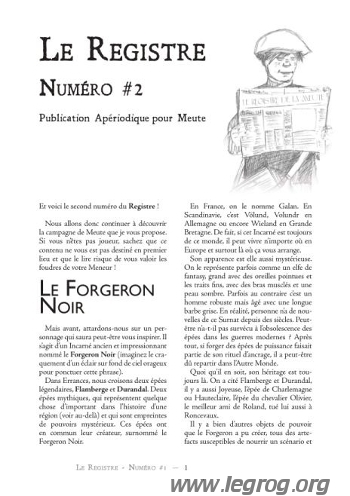 Le Registre est une série de publications officielles pour Meute, à destination des meneurs de jeu, et à la périodicité irrégulière. Ce deuxième numéro (4 pages) continue la campagne entamée dans le premier numéro et commence sur la présentation (1 page) du Forgeron Noir, créateur, parmi d’autres items, des épées Flamberge et Durandal, présentes dans le supplément Errances. Mais surtout, il a forgé Joyeuse, l’épée d’un certain Charlemagne...