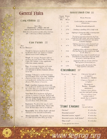 Reference Guide correspond aux pages 539 à 552 d’Ars Magica Definitive Edition remises en page avec un design différent. On y trouve les tableaux et rappels de règles sous forme de texte dans l’ordre suivant :