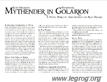 Ce document se propose d'adapter Mythender pour jouer dans l'univers de Golarion, afin d'y faire le ménage dans les dieux  existants. Il propose 6 nouveaux Coeurs (Archmage, Champion, Guardian, Hierophant, Marshal, Trickster) et 2 nouveaux Passés (Overlooked et Slave) en ajout à ceux du livre de base.