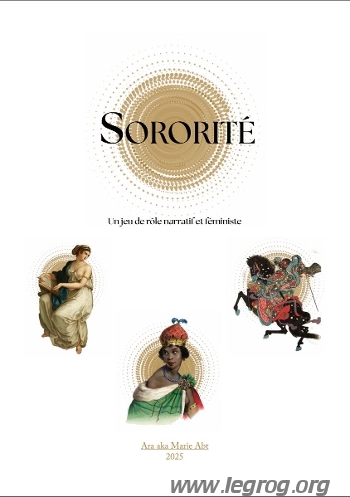 Sororité s'ouvre sur une page de couverture, puis une présentation du jeu lui-même, de la Soutenue et des Lumières, ainsi que des moyens de celles-ci (5 pages). Puis Les Scènes (2 pages) vient expliquer le déroulement de la partie avec les deux scènes de départ (l'invocation des Lumières) et la scène finale (l'Envol) où se joue le destin de la Soutenue. Une page vient alors présenter des fiches vierges pour la Soutenue et les Lumières.